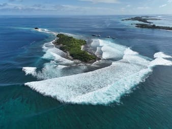 Aerial view of the Sultans, home of the Four Seasons Maldives Surfing Champions Trophy 2024. Photo Credits: Conor Quinlan