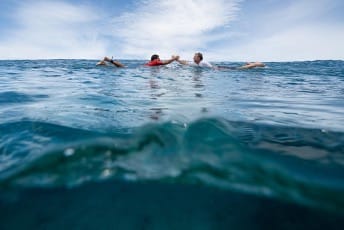 The true spirit of surfing: friends, waves, and the joy of shared success. Photo Credits: Jon Frank
