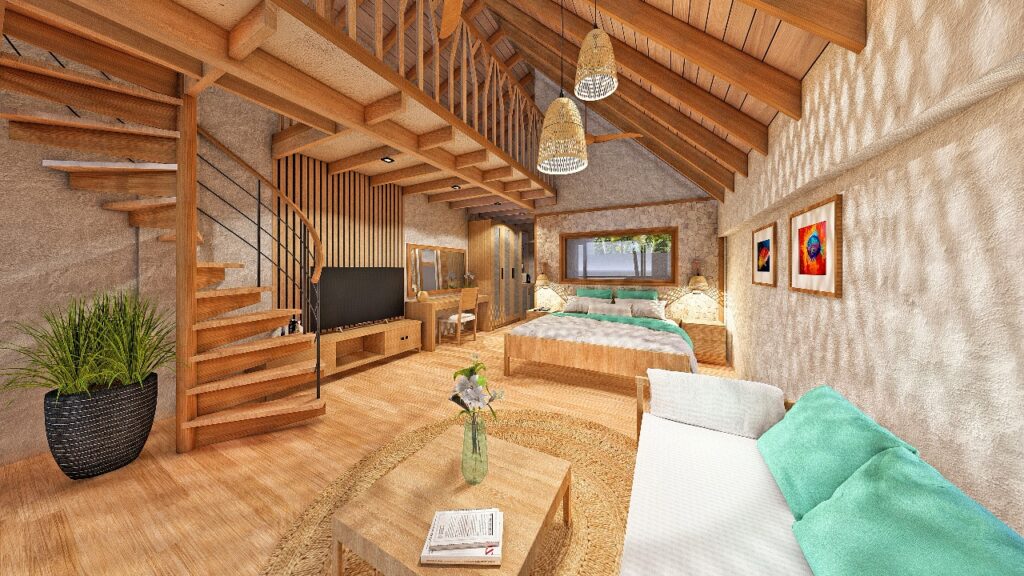 Staying true to Island Luxury’s core principles of community tourism, authenticity, and environmental responsibility, the Retreat has been crafted using locally sourced materials wherever possible. Each detail expertly crafted by local tradesmen reflecting the skill of Maldivian artisans, whilst ensuring the design remains true to the island’s spirit and surroundings. The resulting inviting interiors offer space, comfort and privacy. Mezzanine floors offer ample space for families, whilst spacious decks and balconies offer sweeping views.